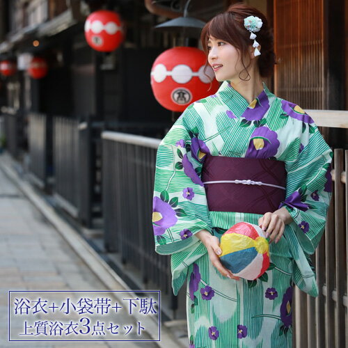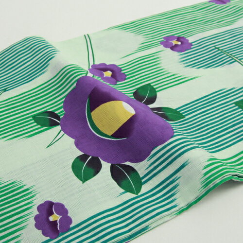 【期間限定30%OFFクーポン】浴衣 レトロ レディース セット 染色&生地が日本製 高級変わり織り浴衣3点セット 「薄緑地に紫椿柄に緑ストライプ」 浴衣 椿 緑